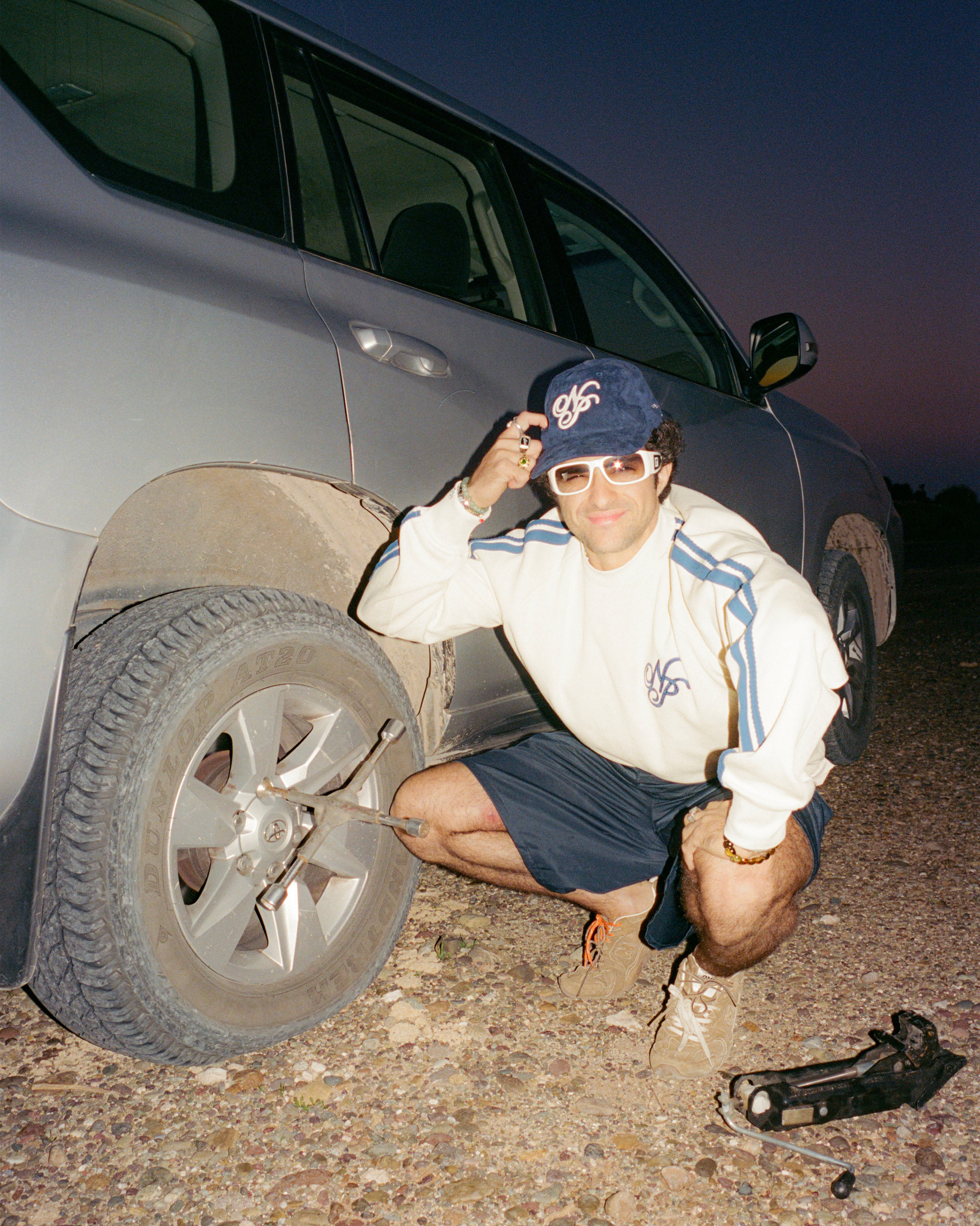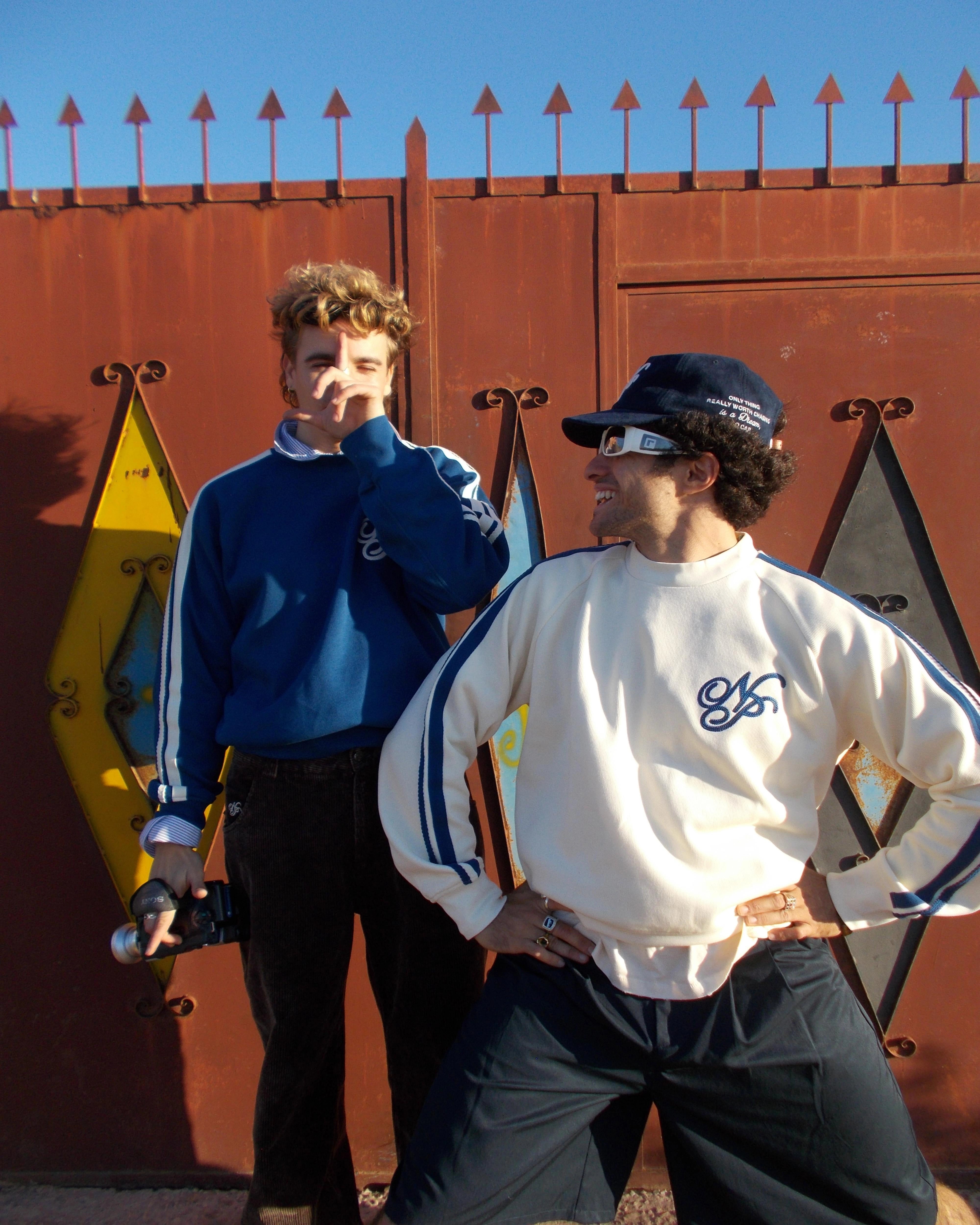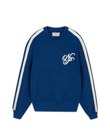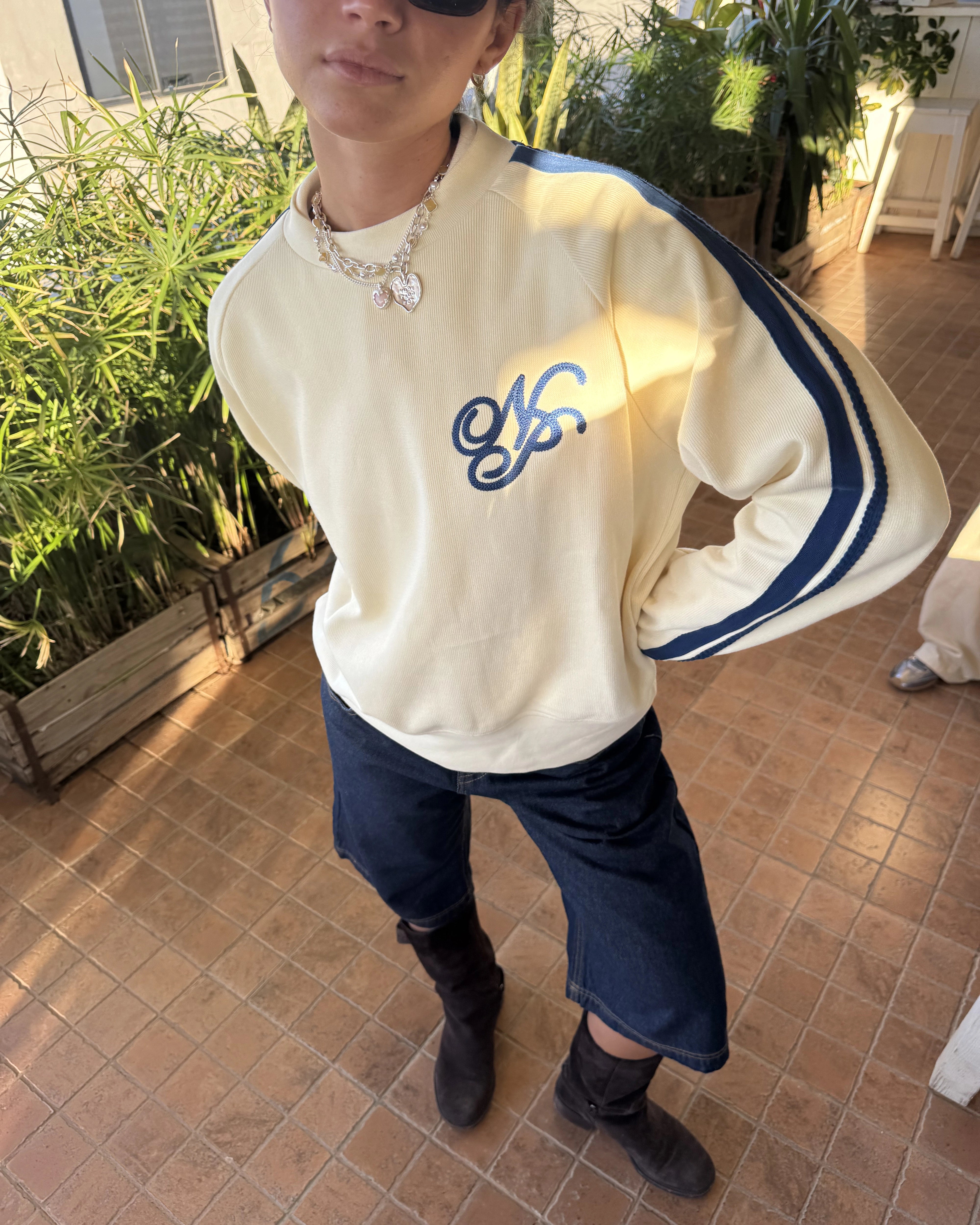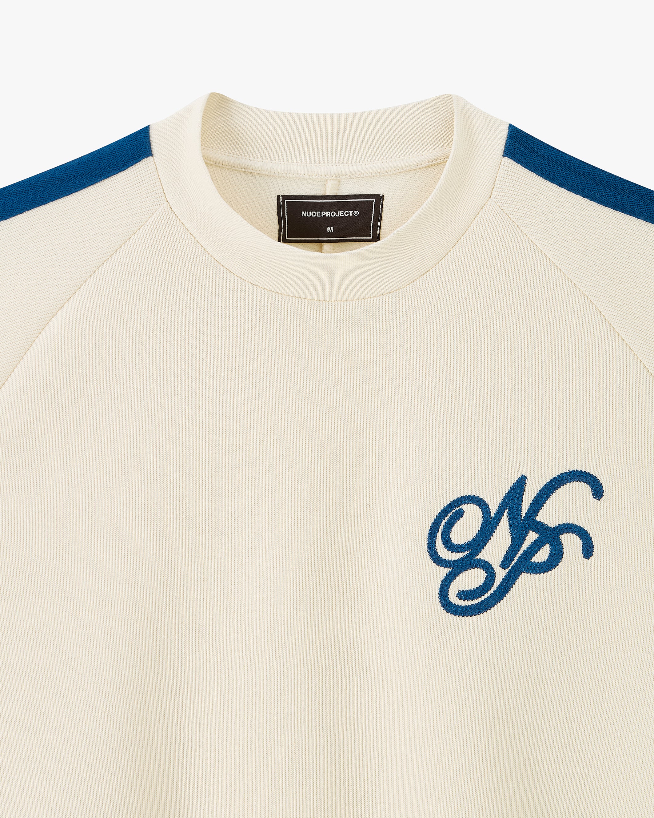 Piqué crewneck with ranglas sleeves, cotton tapes on sleeve sides and front chainstitch emboroidery artwork